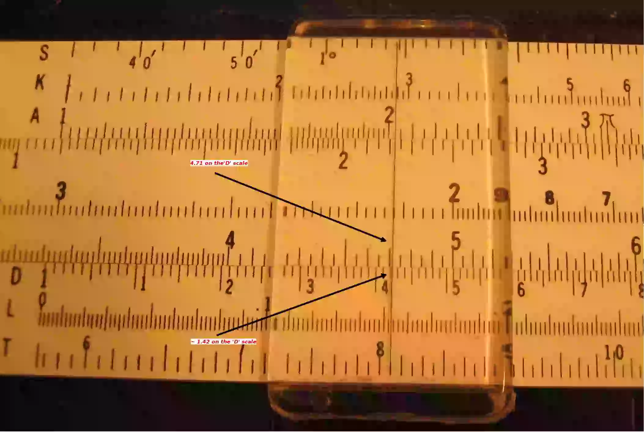Then we move the cursor over to 4.71E0 on the 'C' scale and read our answer directly below on the 'D' scale, in this case, 1.42.